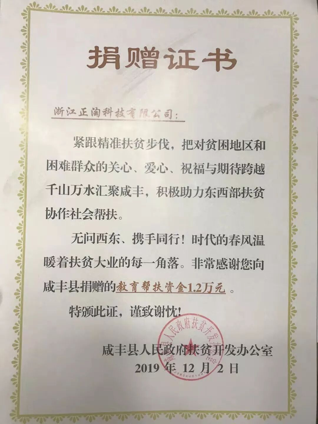近日,浙江正淘科技有限公司为响应精准扶贫工作,发展慈善事业,向湖北省咸丰县捐赠教育帮扶资金1.2万元。