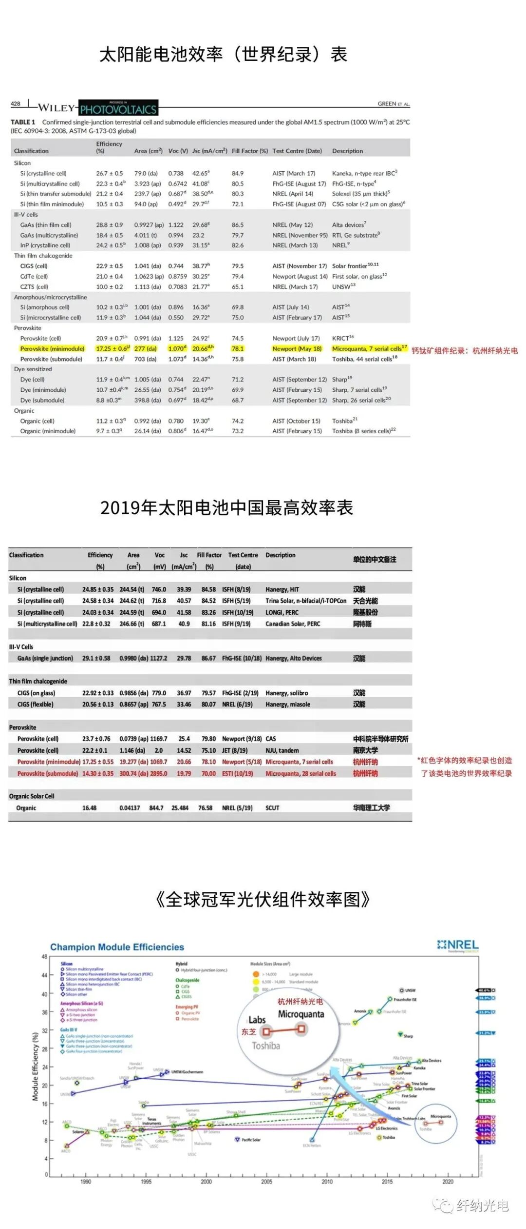 纤纳光电自成立以来重视科技创新,坚持走自主创新之路,在钙钛矿电池效率、大面积制备等方面一直处于世界领先地位。公司目前已申报和获得了100多项知识产权专利,包括多项国际专利。公司自主研发的钙钛矿光伏小组件连续四次打破世界纪录,效率从2017年的15.2%一路提升至 2018年的17.9%(稳态输出效率达17.3%),所有成绩均获美国国家可再生能源实验室认可并被 “太阳能之父”马丁·格林教授收录在他与美、日、意、澳等多国科学家联合编撰的《太阳能电池效率表》中。同期入选的均为世界一流科研机构和企业,纤纳光电是唯一一家连续上榜的中国机构。2019年,公司首批钙钛矿商业化大组件成功下线,并通过欧洲权威检测机构的严格检测,获得11.98%的效率认证,超越了日本东芝公司之前创造的钙钛矿商业化大组件效率纪录。此外,公司的创新成果还多次被国际权威学术期刊《Nature》和《Science》引述。中央电视台、《人民日报》、新华社和《浙江日报》等媒体均对公司做了相关报道。