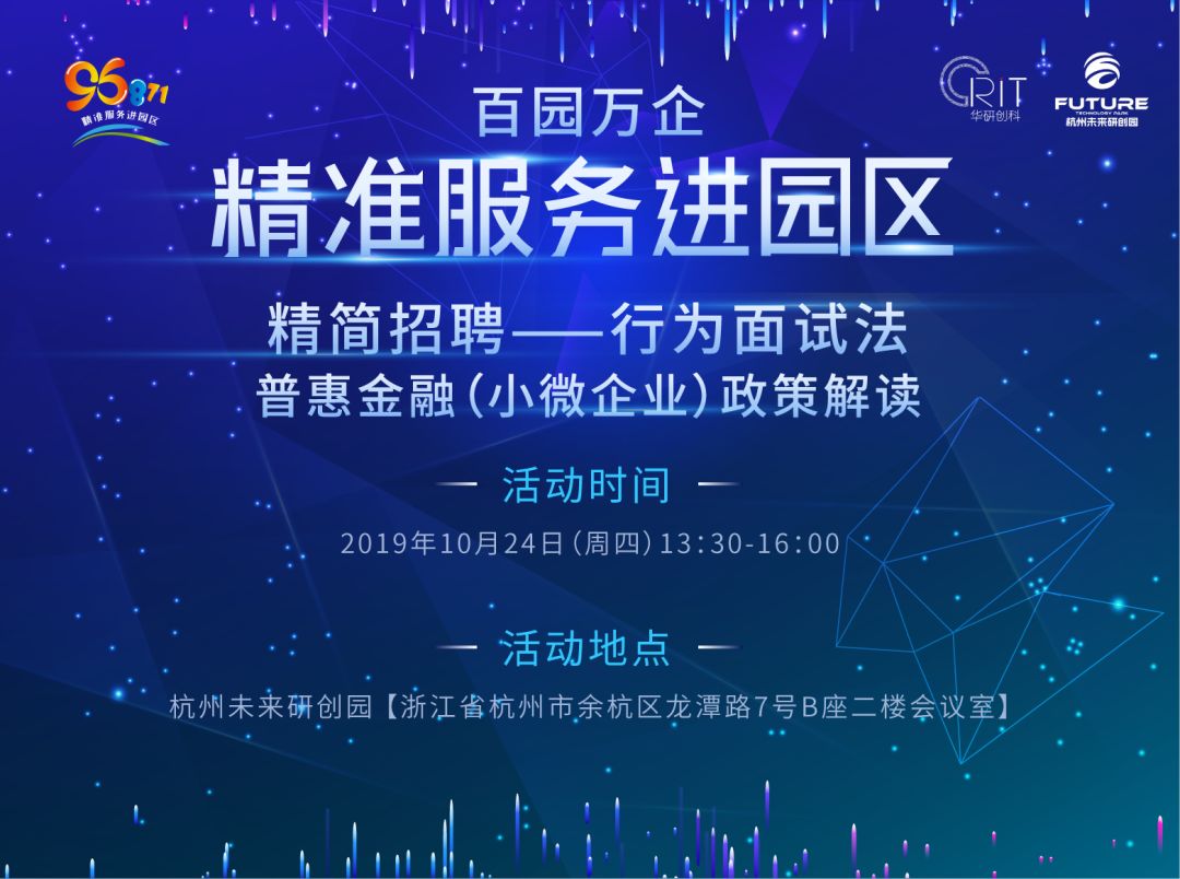 第一期活动成功举办,极大加强各企业的活动参与度。为了进一步方便各企业进行人才的招聘和用人的选择,杭州未来研创公园特别联合了浙江省中小企业公告服务平台筹划了本期百园万企活动,本次活动的主题为《精简招聘-行为面试法》,本次活动旨在帮助企业的HR能有效的帮助企业内需要进行人才选拔和人才管理的人员,以行为相关特征来判断和优化企业招聘。